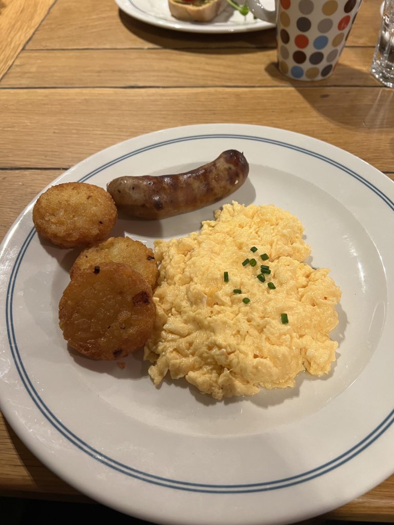Top of the morning to you, Governor! Here we are on day 2 of this adventure. My roommate for the week, Cammie, did not mention anything about me snoring, so I’ll take that as a win! Breakfast is included in our hotel, so we trundled downstairs (after enjoying a cup of Nespresso coffee in the room first) for breakfast. Wary of a Full English Breakfast, I choose eggs, sausage and hash browns. Enough to energize me for the day.