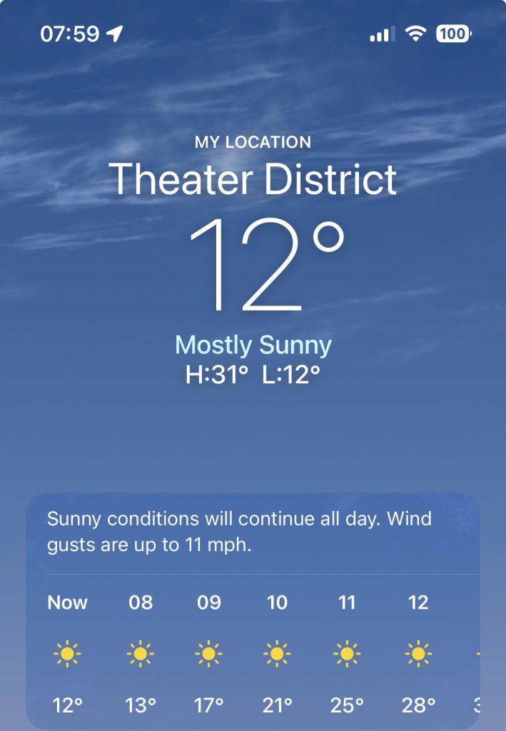 One of our travel mates had to run back to the hotel…and this is where we failed as a group. Instead of sending her on her merry way. We all piled into an Uber and rode with her back to the hotel. Bear in mind the restaurant was closer to the theater than the hotel…but no matter. We dropped her at the hotel and then turned around to go back to the theater. The initial plan was to swing by Central Park before the show. Traffic was atrocious today. The uncleared roadways were causing all sorts of consternation. We ran out of town and had to go straight to the theater.